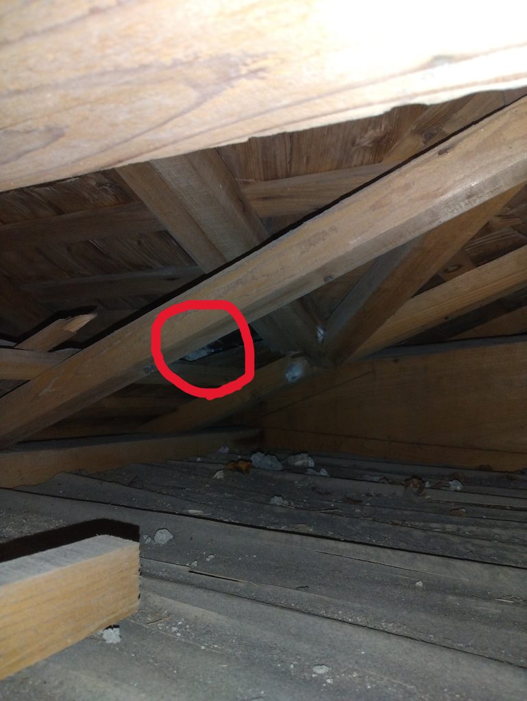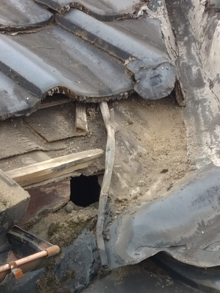 屋根裏と屋根に登って状況を確認してみると、屋根裏からでも見えるくらいの大きな穴が開いていました。