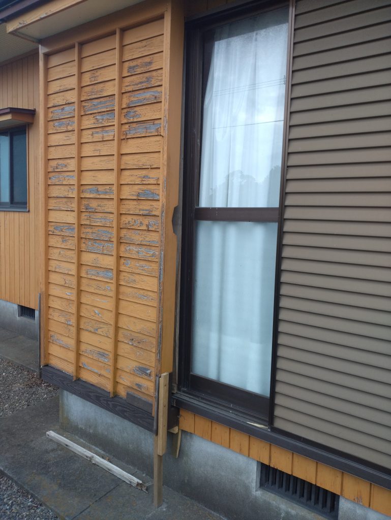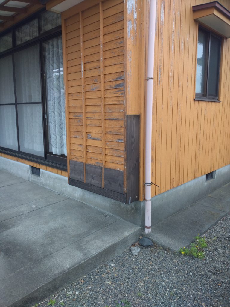 木製の雨戸は老朽化かと思われる木材の腐れがあり、雨戸下部付近に黒っぽく見られるのは木材で、家主さんが補修されていらっしゃいました。