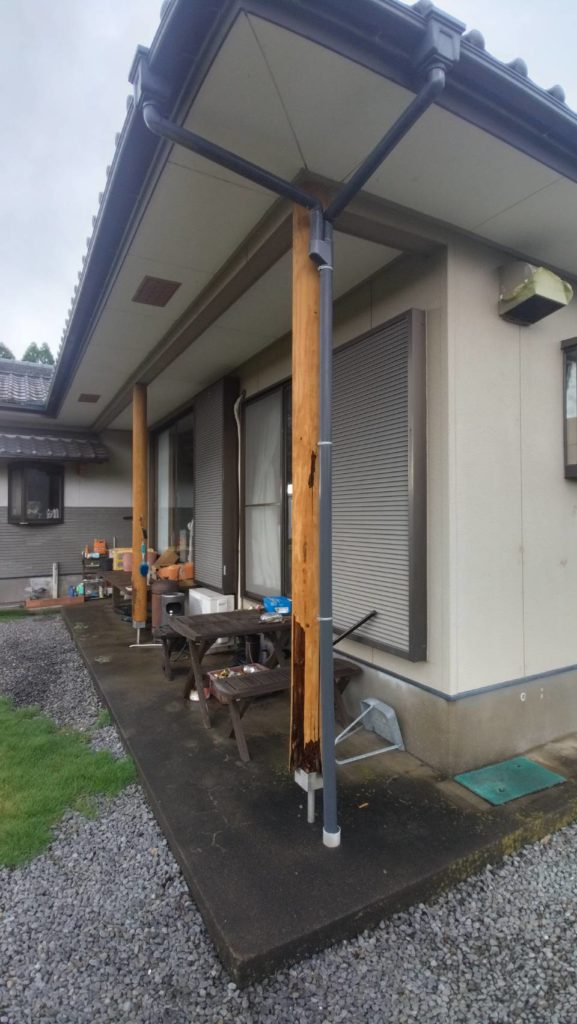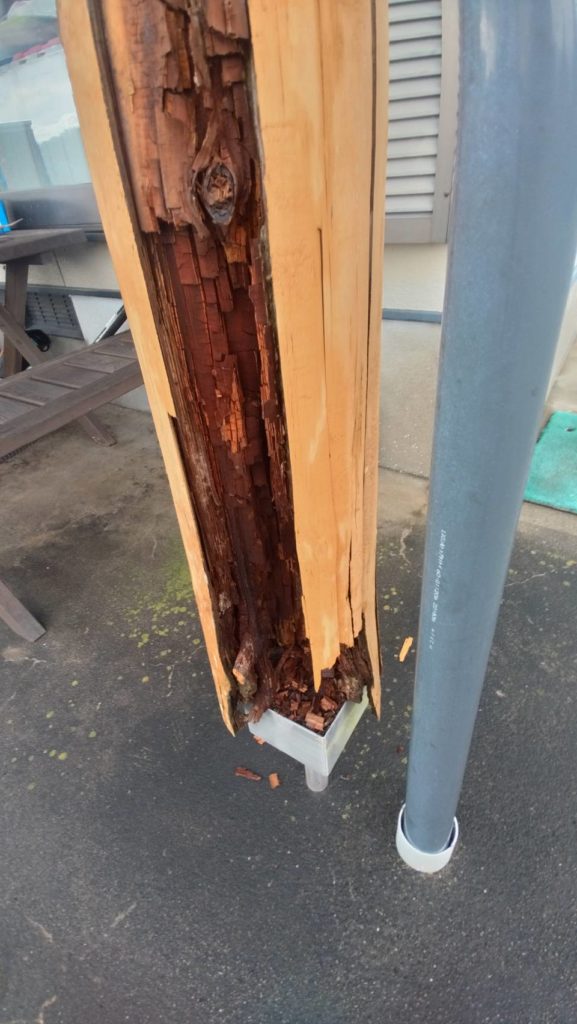 後日、材料が揃ったところで本格的に柱の入れ替え作業をしました。この状態になると小さな振動でも崩れ落ちる可能性もあるので慎重に作業しました。雨と年月により柱は上まで腐っていました。怖いですね。ジャッキアップをして何とか2本とも入れ替え出来ました。